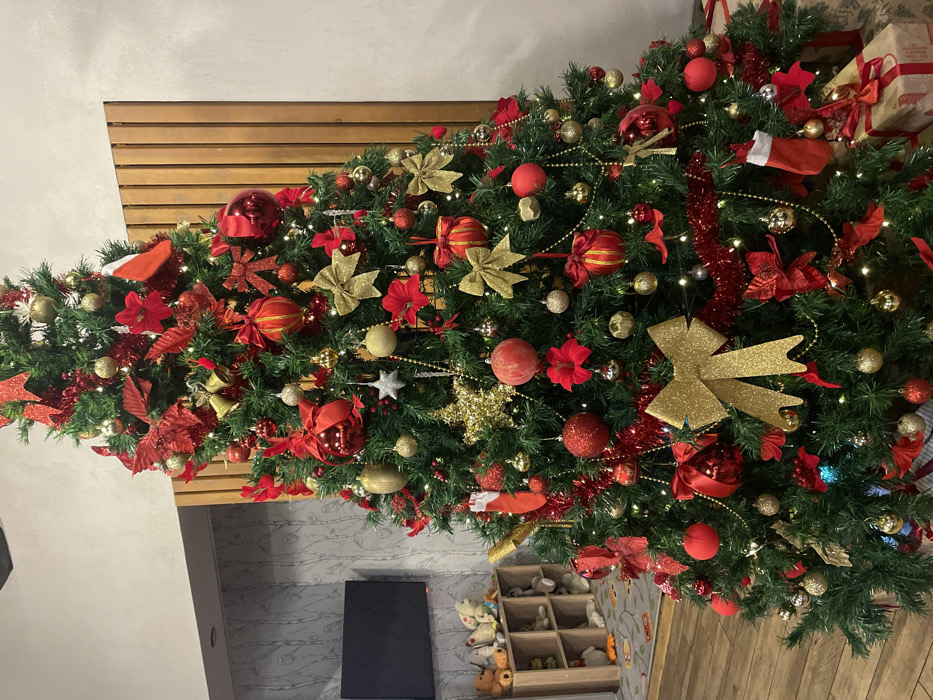 The image displays an indoor setting dominated by a large, artificial Christmas tree