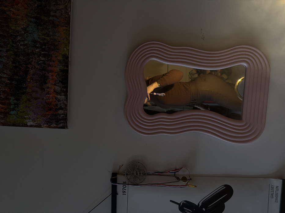- "The image displays an indoor scene featuring the reflection of an individual in an irregularly wavy, multi-layered pink framed mirror" by FM-u6xV42, licensed under CC BY 4.0