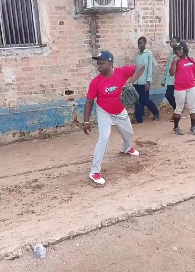 man in a red t-shirt, gray pants, a baseball cap, and white sneakers with red accents demonstrating a baseball pitch in front of a brick building. He is wearing a baseball glove on his left hand. Three other people, two men and one woman, are standing behind him, all wearing red t-shirts. The ground is dirt and there is a small rock in the foreground. An air conditioning unit is mounted on the brick wall behind the man.