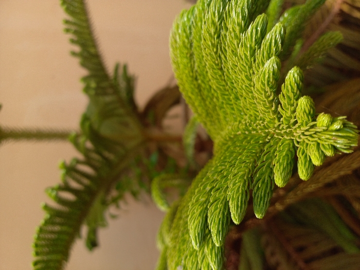The image displays a close-up, high-angle view of the vibrant green foliage of a conifer-like plant, identified as being located in Oturkpo, Nigeria. The foreground shows a central branch with numerous densely packed, scale-like, bright green leaves, arranged spirally and extending outwards, creating a textured, somewhat feathery appearance. These leaves exhibit a fresh, possibly new growth, and are sharply in focus. In the blurred background, another part of the same plant or a similar one is visible, along with a plain, smooth, light brown or beige surface, likely a wall, indicating an artificial backdrop for the plant. There are no individuals, actions, or human-made objects other than the implied structure of the background. The scene is illuminated by soft, diffused light.