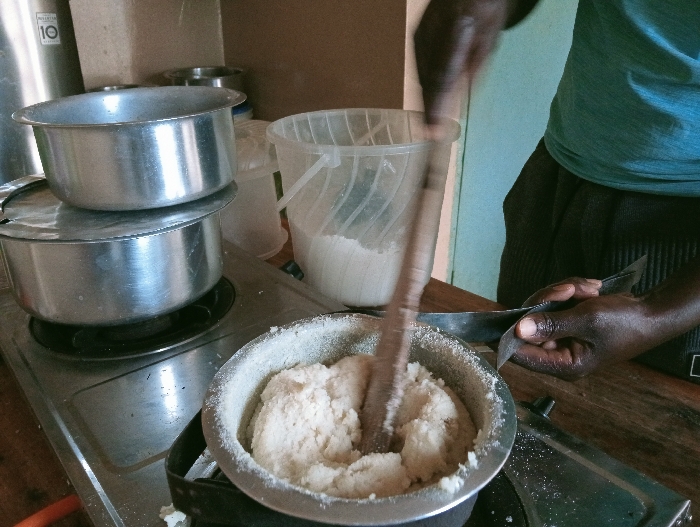 An individual is depicted in a kitchen setting within the city of Lumakanda ward, Kenya, engaged in cooking. The scene features a dark-skinned person, whose hands and forearms are visible. The person wears a light blue shirt and dark lower garment or apron. They are actively stirring a light-colored, lumpy substance, consistent with ugali, in a silver-colored pot positioned on the right burner of a black two-burner gas stove. A wooden stirring stick (mwiko) is used for this action, held by the individual's right hand, while their left hand stabilizes the pot's rim or handle. To the left of the active burner, two silver-colored cooking pots with lids are stacked on the left burner of the stove. A clear plastic bucket, partially filled with a white powdery substance (likely flour), is visible in the background to the right of the stove. An orange gas hose is partially visible at the bottom left. A wooden surface supports the stove, and the background wall is painted in shades of light beige and light blue-green. A metallic object, possibly a thermos with the number "10" visible, stands on the far left.