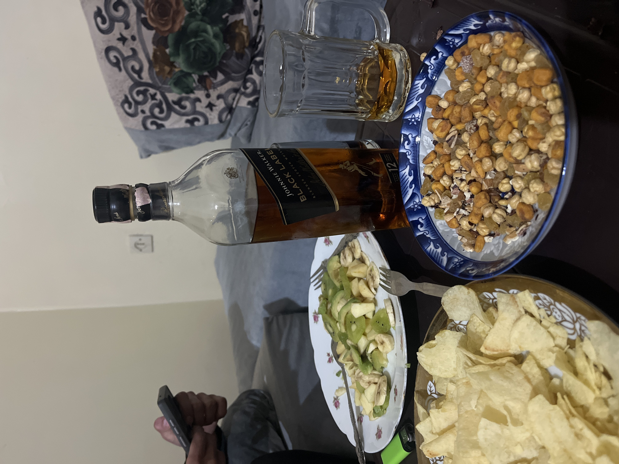 - "A table setting includes a bottle of Johnnie Walker Black Label whisky, a glass with a golden liquid, a blue patterned plate with mixed nuts, a plate of sliced kiwi and banana with cutlery, and a plate filled with potato chips" by FM-HpdTa2, licensed under CC BY 4.0