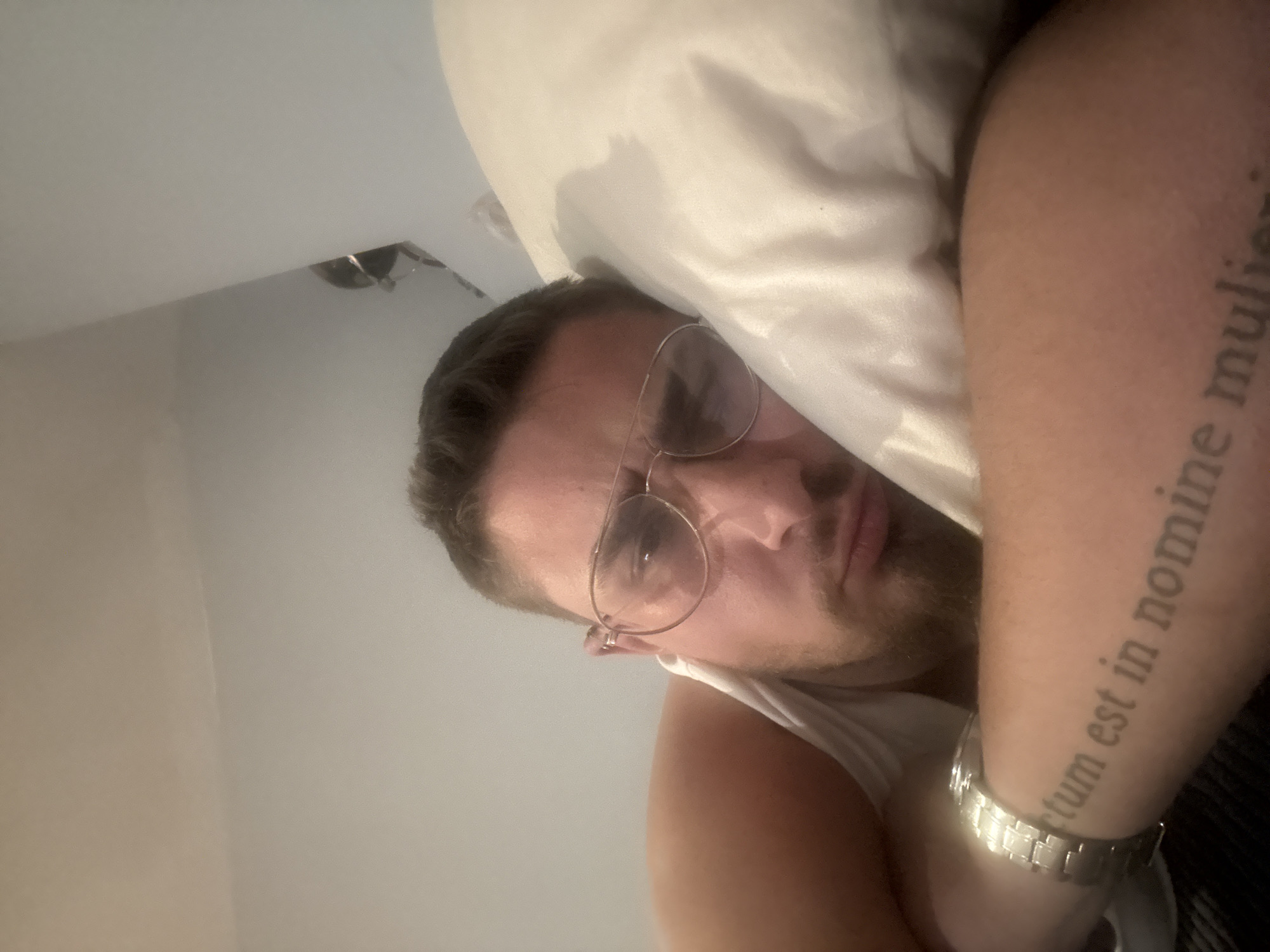 A close-up, selfie-style shot depicts a person lying in bed, with a white pillow partially obscuring the upper portion of their head and face. The person is wearing glasses with a wire frame. A portion of the person's left arm is visible, featuring a tattoo in Latin text and a silver watch. The background consists of an off-white or light gray wall and part of a ceiling. The location is not discernible from the image. The image is not of Haskovo, Bulgaria.