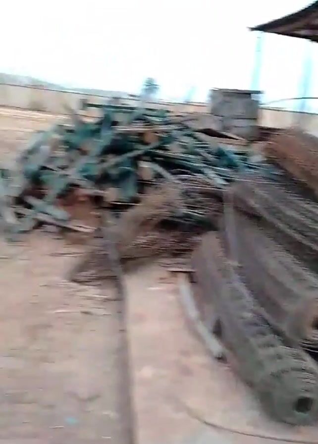 fenced outdoor industrial area containing construction materials and equipment. Initially, a large pile of rolled wire mesh lies on the ground beneath a covered structure. The camera then pans to show a pile of metal bars and wire. A small gasoline-powered engine sits on a wooden pallet near a concrete mixer. Finally, the camera shows the concrete mixer located on a metal sheet near debris.