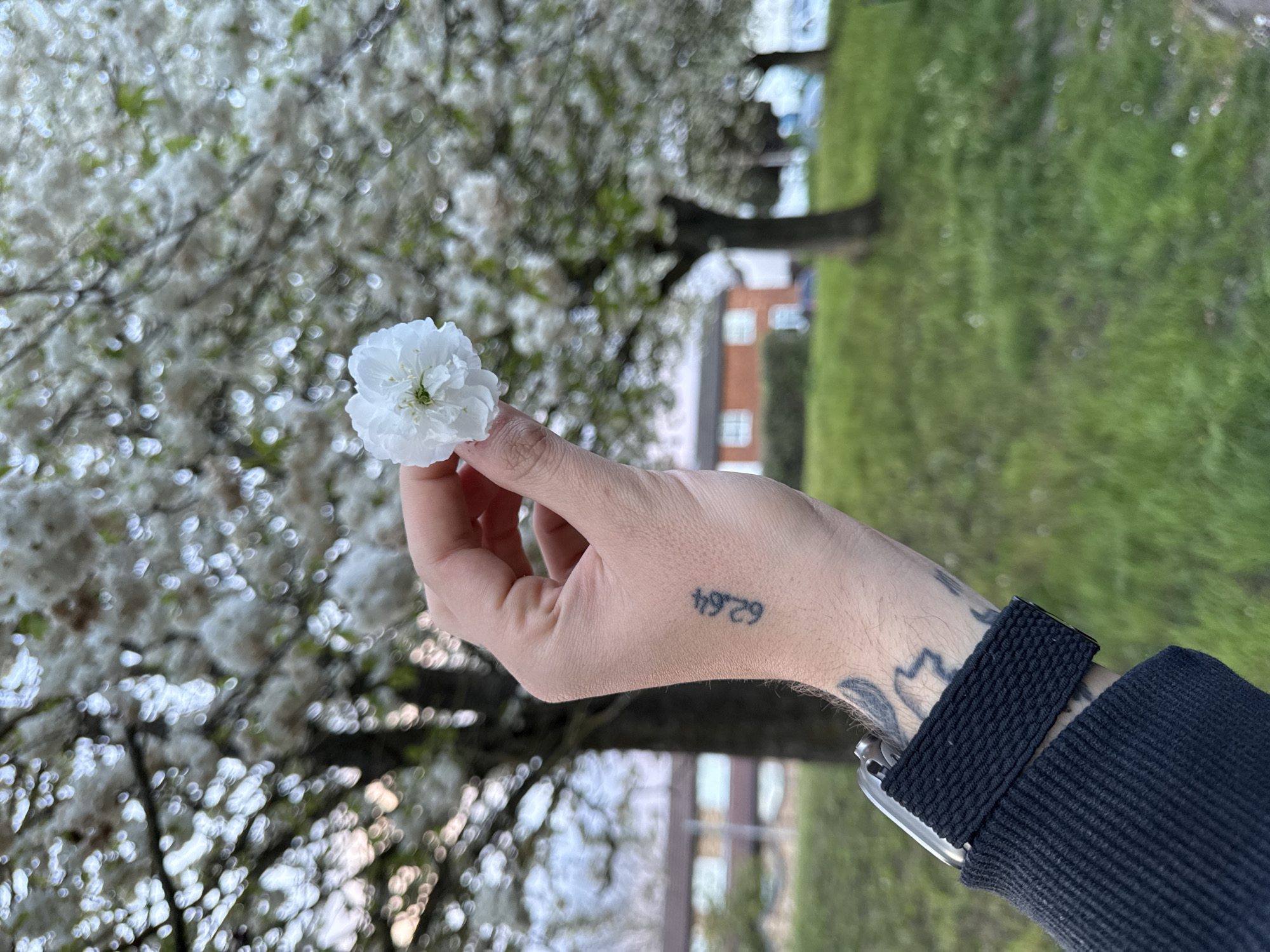 A photograph captures a hand holding a white flower in front of a blossoming tree. The hand belongs to a person with a tattoo on their wrist with the number 62.64. Another tattoo is visible closer to the black wrist band. The background includes a green lawn and a building, suggesting the scene is set in Hitchin, United Kingdom. The image appears to be taken outdoors, likely during spring.