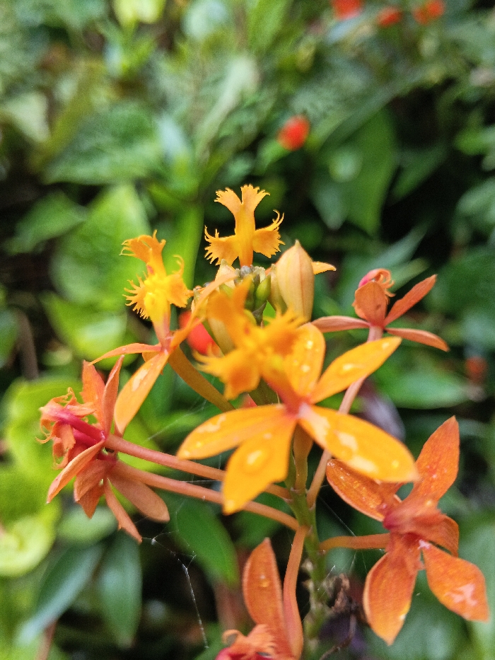 A cluster of Epidendrum radicans blooms with vibrant orange petals dominates the foreground against a backdrop of blurred green foliage. Water droplets gleam on some petals. The unique, fringed form of the central flower draws the eye, while thin strands of spider silk connect some stems. The overall composition presents a close-up view of the plant's intricate beauty.