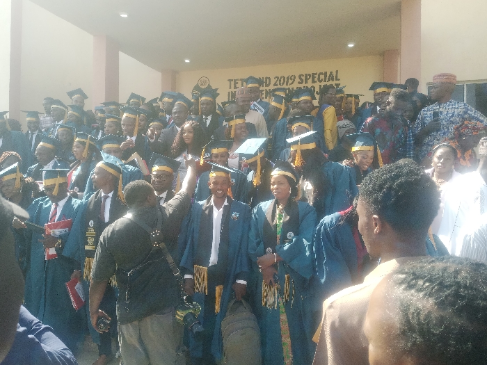A large group of approximately 50-70 individuals, primarily young adults, is gathered outdoors under bright daylight, likely at an educational institution in Gwafan, Nigeria. The backdrop features a light-colored building with a banner displaying the text "TETFUND 2019 SPECIAL INTERVENTION PROJECT" and an emblem. Most individuals are dressed in academic regalia, consisting of teal-blue gowns with gold stoles and trim, and matching mortarboard caps with gold tassels. Many are smiling and looking towards the viewer or a central point, suggesting a group photograph or celebration. Several individuals hold red books or binders, and one male in the foreground on the right holds his academic cap aloft. A male photographer, dressed in a dark shirt and pants, is visible from the back, holding a professional camera with a lens, positioned to capture the crowd. Interspersed among the graduates are a few older adults, some in traditional patterned clothing. The scene conveys a celebratory atmosphere.