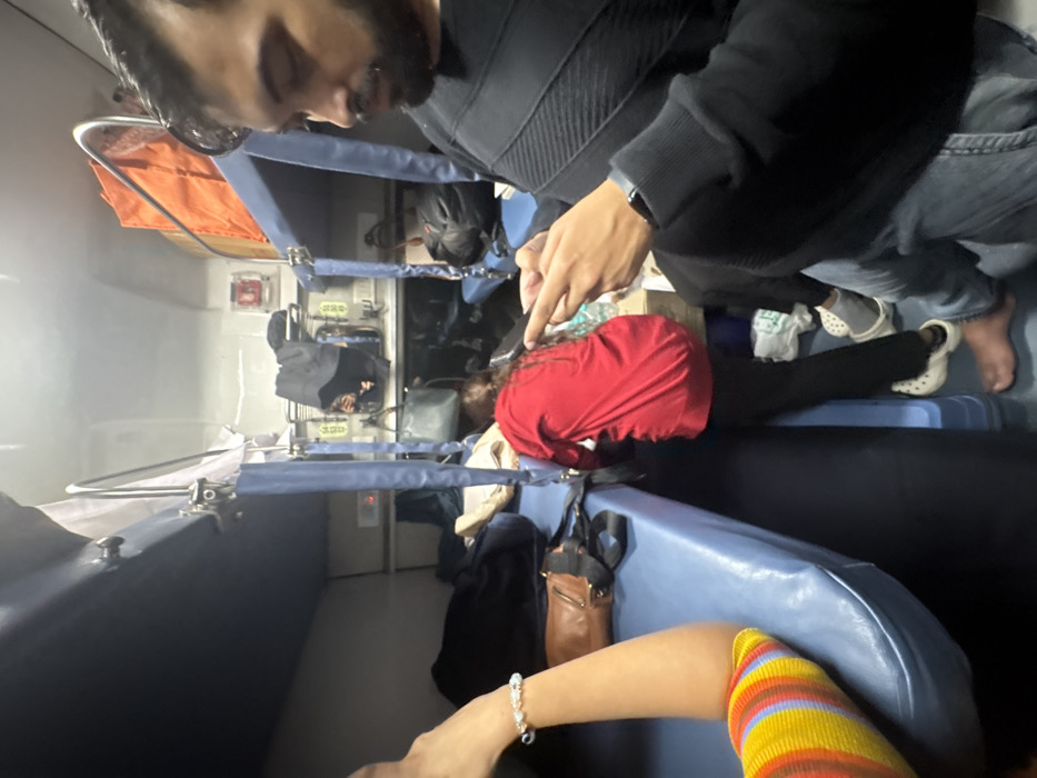 A crowded train compartment shows multiple passengers in close quarters