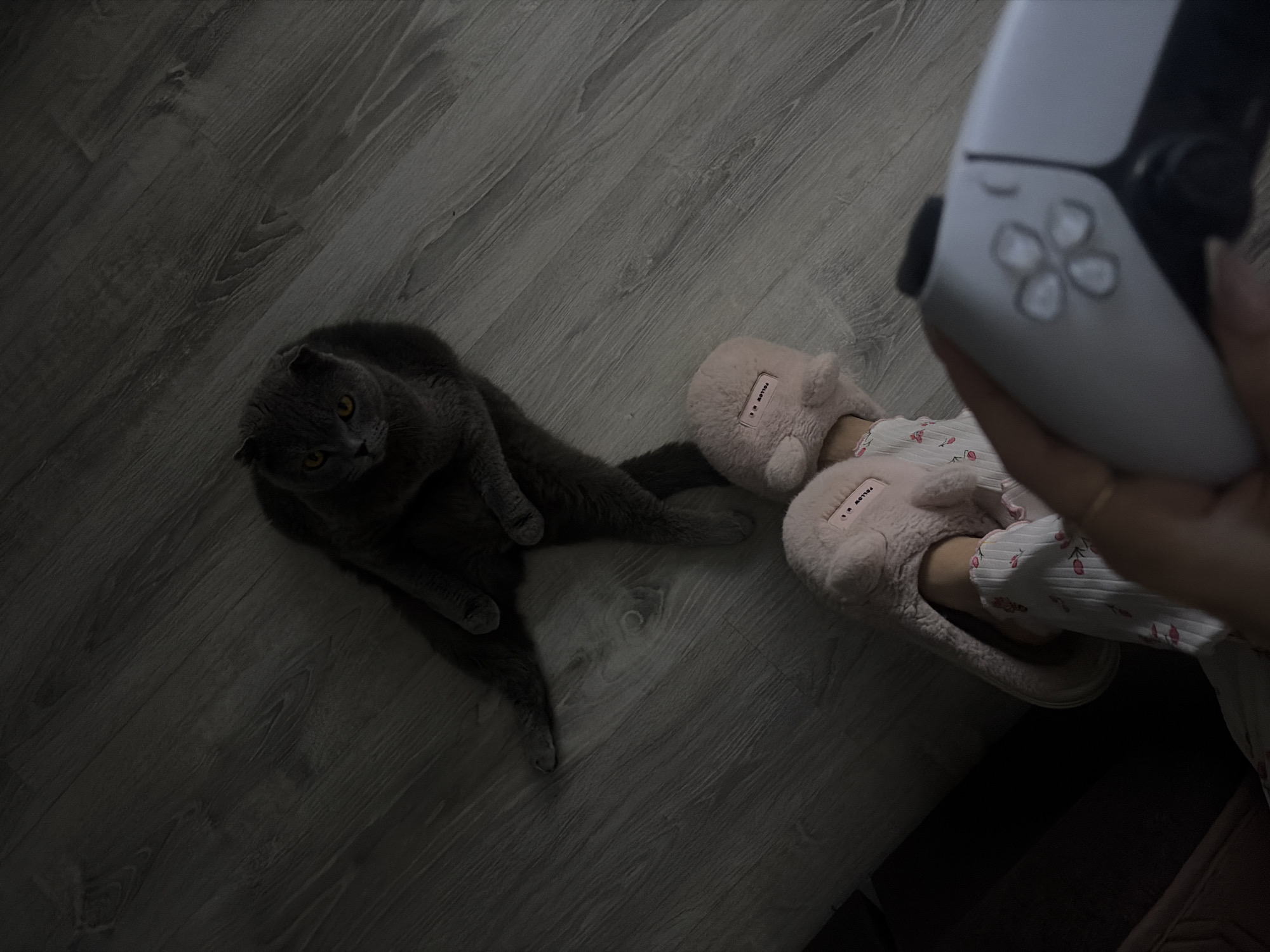 A gray Scottish Fold cat lies on a gray wood floor, looking at the camera. Next to the cat are feet wearing pink bunny slippers and white pajamas with a floral print. A white Playstation 5 controller is held in a hand in the upper right of the frame. The environment appears to be indoors, with the subject lying on the floor in front of a couch. The location in Saint Petersburg, Russia is not discernible from the image.