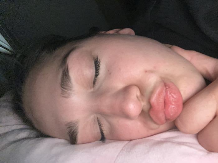 A close-up image depicts the right side of a human face resting against a light pink, textured fabric, likely a pillow or blanket. The individual's eyes are closed, with visible dark eyelashes and eyebrows. The lips are distinctly puckered into an exaggerated "kissing" pose, showing prominent vertical skin folds. A small, dark mark is discernible on the cheek above the left side of the upper lip. A hand, with fingers partially visible, appears to cradle or support the head from the right side of the frame; a thumb is prominently featured. The background directly behind the head is dark and undifferentiated. The immediate environment appears to be an interior setting, devoid of specific markers to identify a location within the city of Rennes, France.