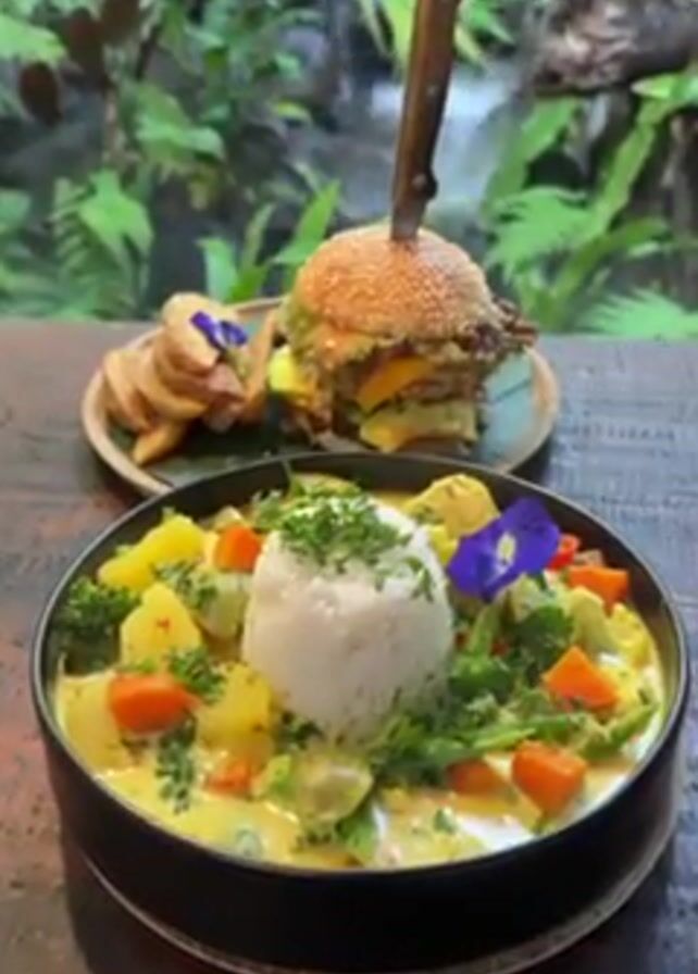 two plates of food sitting on a wooden surface. In the foreground is a bowl of vegetable curry, with a scoop of white rice in the center, garnished with parsley and a blue flower. Behind this is a plate containing a tall burger with a knife stuck into the top bun, and a side of potato wedges decorated with another blue flower. The food is positioned in front of a backdrop of green plants, with a small waterfall visible in the background. The overall setting suggests an outdoor restaurant with a natural, possibly tropical, ambiance.