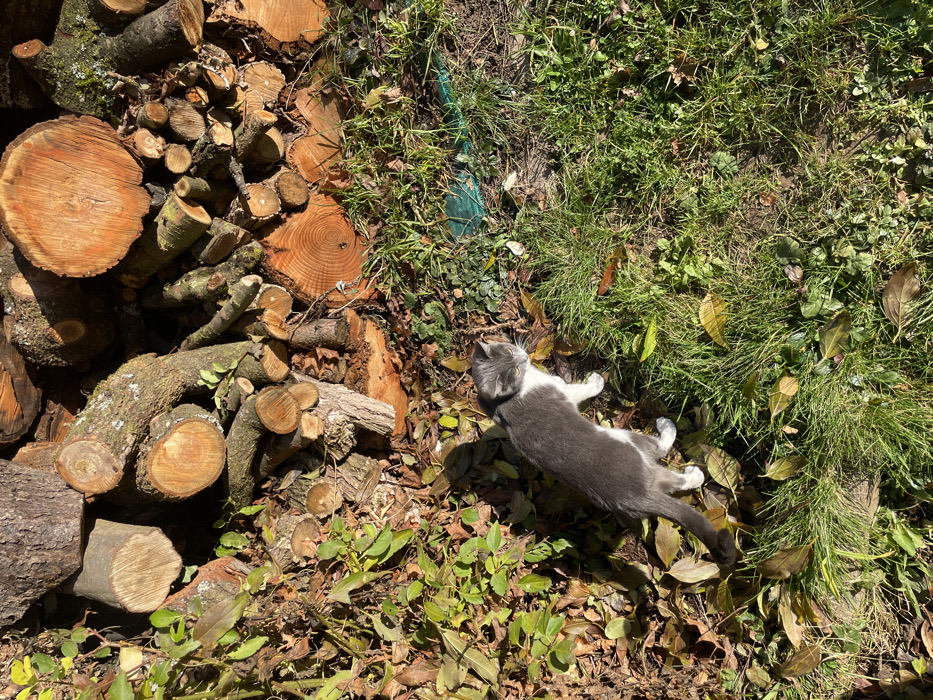 - "A gray and white kitten lies on its back, paws up, amidst fallen leaves and greenery near a pile of logs" by FM-RVx413, licensed under CC BY 4.0