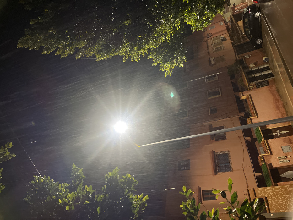 At night, rain streams down around a bright street lamp. Buildings stand tall on the right, their windows visible, and a car is parked near the top. Trees with leafy green branches border the top and bottom of the image. The rain is illuminated by the street lamp, creating a dense, atmospheric scene.