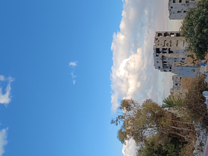The image depicts a panoramic view of a war-damaged urban environment in Zamalka, Syria, under a partly cloudy sky. The upper two-thirds of the frame are dominated by a clear blue sky with scattered white cumulus clouds, more concentrated towards the horizon. The foreground, positioned in the lower left, shows a pile of construction debris or rubble, including fragments of concrete and some lighter-colored refuse. Directly behind this, a cluster of trees and dense, dry scrub vegetation with light green to brown foliage occupies the mid-ground. To the right of the vegetation, in the mid-to-background, stand several severely damaged multi-story concrete buildings. The most prominent structure, centrally located, is a skeletal concrete building exhibiting extensive destruction, with numerous large holes and pockmarks consistent with shelling or explosions, exposing internal structural elements. Similar, though less distinct, damaged buildings are visible further in the background, extending across the right side of the frame. The ground between the vegetation and the buildings appears to be barren, light-colored earth or sand. No individuals or discernible actions are present in the scene.