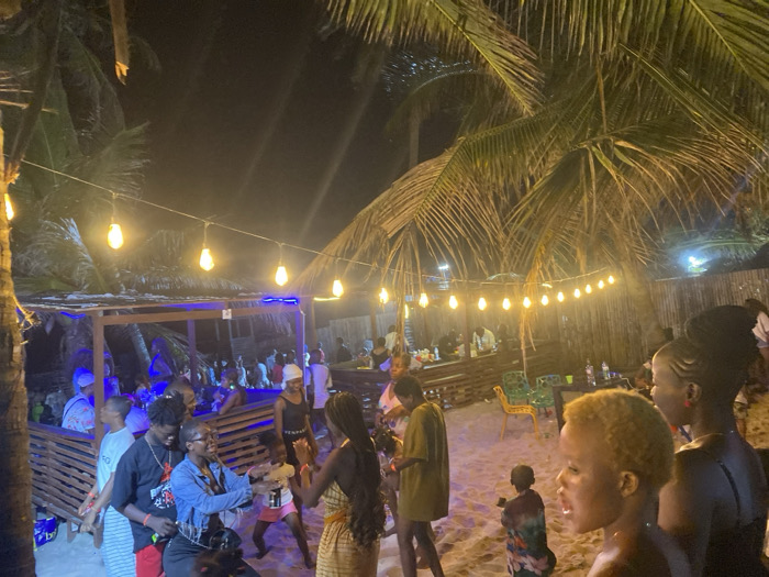 A lively nighttime scene unfolds at an outdoor beach bar. Guests gather under palm trees adorned with strings of warm lights. Some patrons sit at wooden tables while others dance on the sand. The structure of the beach bar is dimly lit with blue accent lighting. People of various ethnicities are present, dressed in casual attire. The overall atmosphere is festive and relaxed.