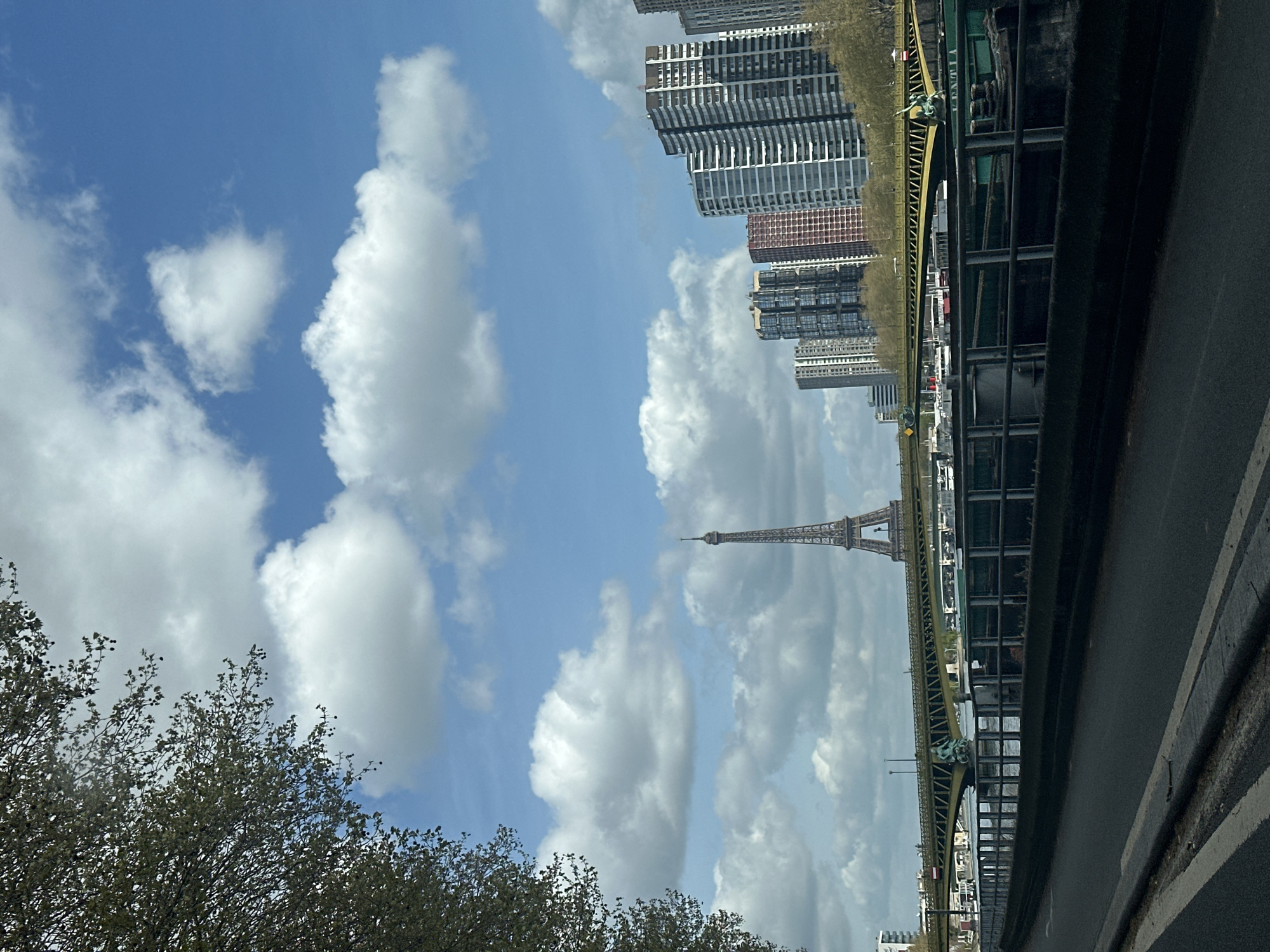 Eiffel Tower in Paris, France, as seen from a high angle, likely from a bridge or elevated road. The foreground includes a bridge structure, part of a road, and trees. In the background, there are modern high-rise buildings. The sky is blue with white clouds. The perspective suggests the photo was taken while moving along a bridge, possibly in a vehicle.