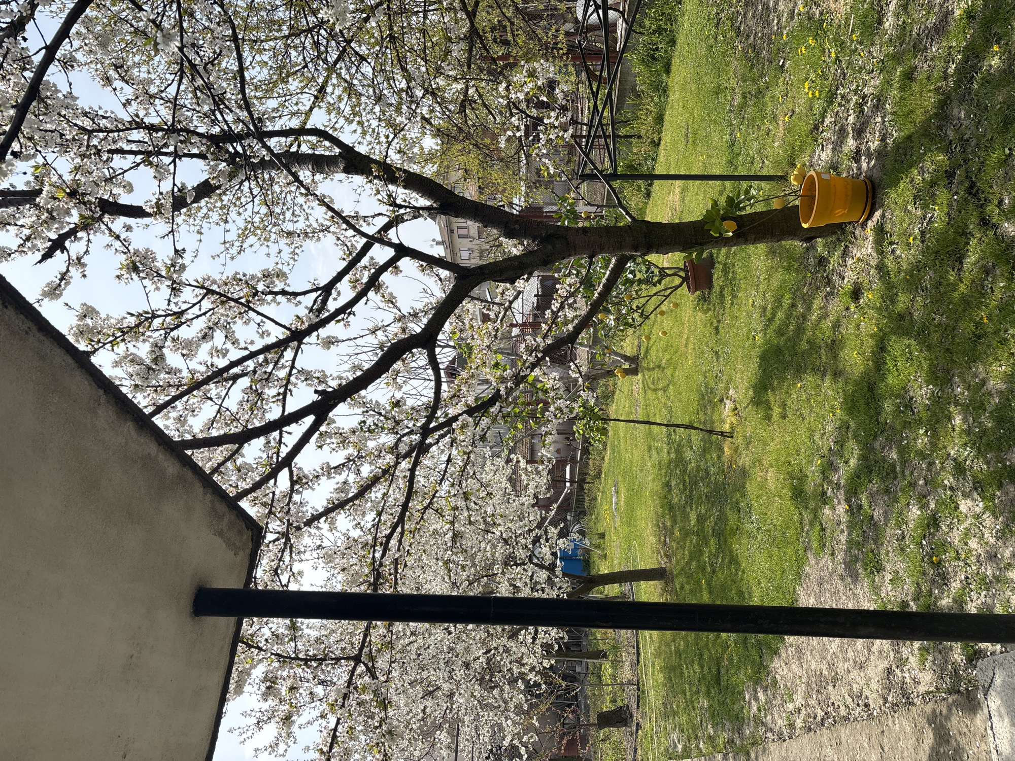 The image depicts a residential garden in Banya, Bulgaria. A flowering tree dominates the scene, its branches covered in white blossoms filling a large portion of the frame. The tree is positioned in front of residential buildings with tile roofs, suggesting a suburban setting. The lawn is green with patches of yellow flowers and dappled sunlight. A yellow bucket sits near the base of the tree, and terracotta pots are also visible. In the foreground, a portion of a building wall with a black metal pipe extending from it is visible. A black metal structure stands in the background of the garden. The image is taken from a low angle looking upwards at the tree and surrounding environment.