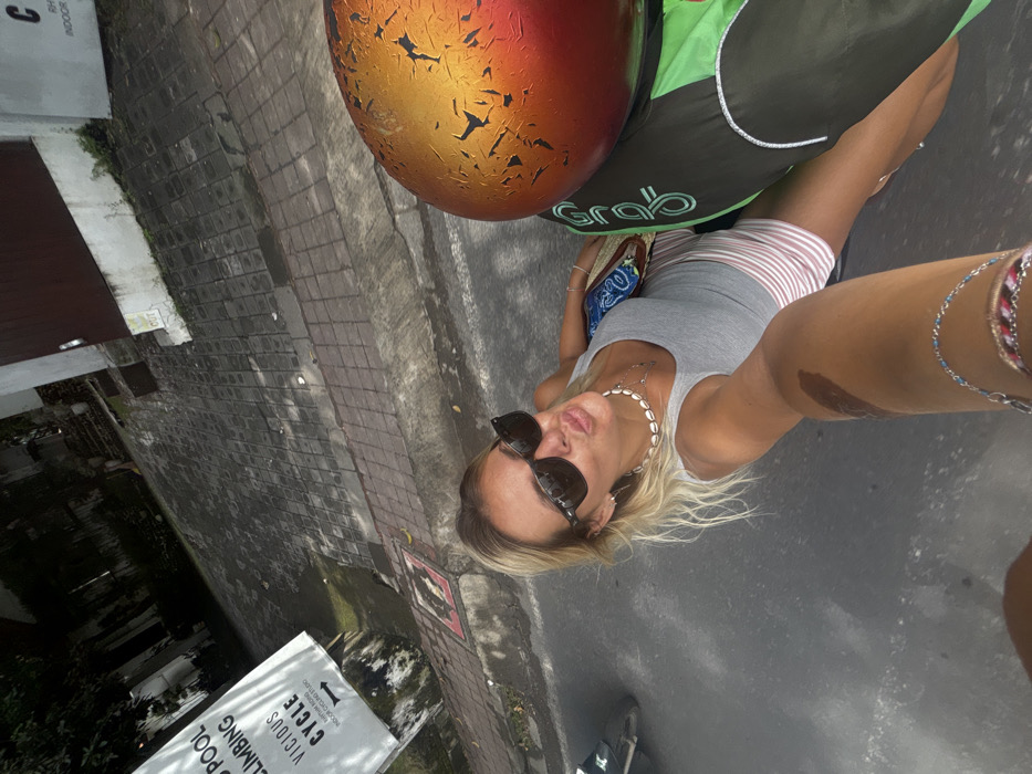 A woman takes a selfie while on a motorcycle, wearing a gray tank top, striped shorts, and sunglasses. An orange-yellow helmet with cracks is visible above her, along with a green Grab delivery bag. She wears a shell necklace and bracelets. The background shows a street, building, and signage indicating "VICIOUS CYCLE CLIMBING POOL," partially obscured. The camera angle is tilted, capturing the scene from a high perspective.