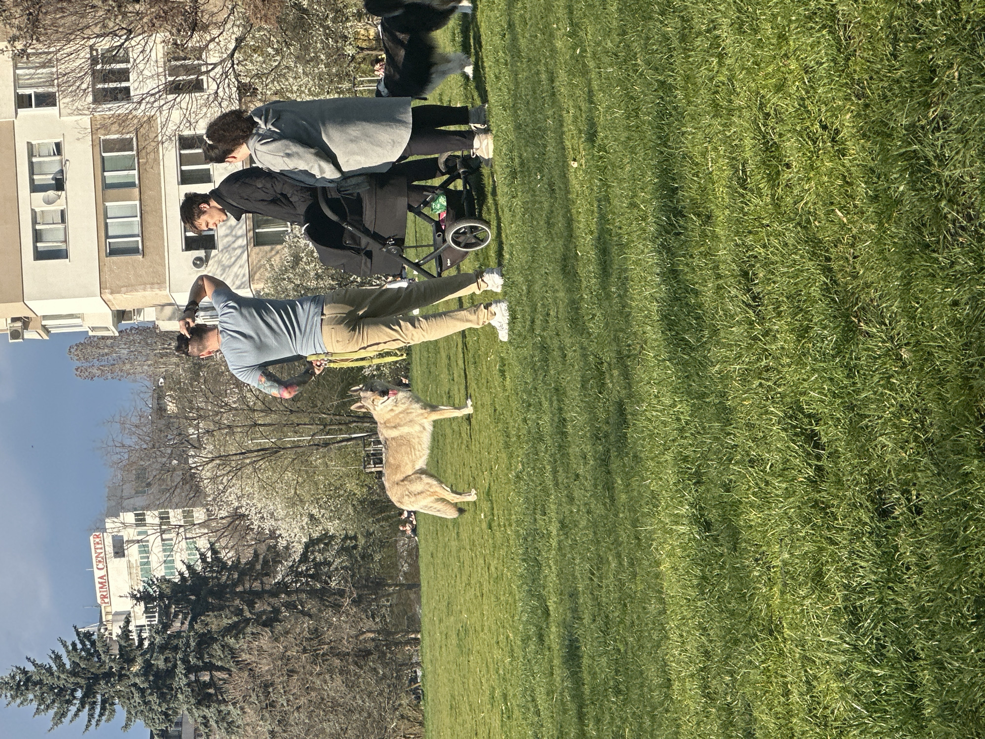 park scene in Sofia, Bulgaria. In the background, there is a building with the inscription "PRIMA CENTER." A man in a light blue shirt and khaki pants is standing on the grass, looking to the right, with his arm raised. To his left is a statue of a coyote on the grass. Further to the left, two people stand near a baby stroller. One is wearing a black jacket, and the other wears a grey coat. Trees and green grass dominate the scene.