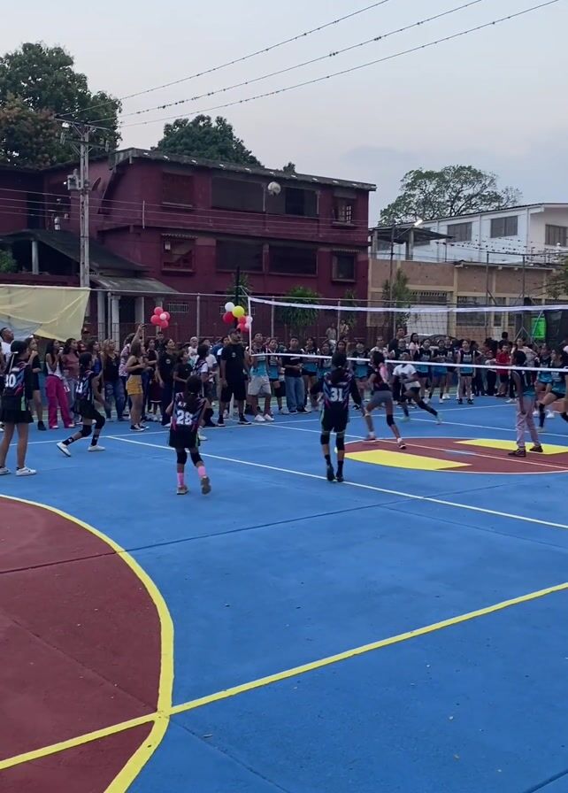 The video captures a volleyball game on a vibrant blue outdoor court with red and yellow markings. Teams in matching uniforms, one in black with pink accents, face off across a net. Spectators line the perimeter of the court, creating a lively atmosphere. In the background, buildings and trees are visible under a cloudy sky. The game is in progress, with players actively involved in volleyball movements.