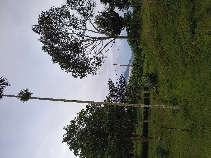 The scene captures a verdant, hilly landscape in the city of Unknown, Vietnam, under an overcast sky. In the foreground and midground, green grass covers uneven terrain with gentle slopes and small mounds. Several trees with dense green foliage and light-colored trunks are scattered across the left and center. A particularly tall, slender tree with a mostly bare trunk and a small cluster of leaves at its apex dominates the central view. To the right, a large, mature tree with a full, dark green canopy stands on a slight elevation. In the mid-background, a wooden utility pole with attached wires forming a dotted line against the distant view is visible. Beyond this, distant mountains or hills are partially obscured by atmospheric haze or low clouds. No people or animals are present.