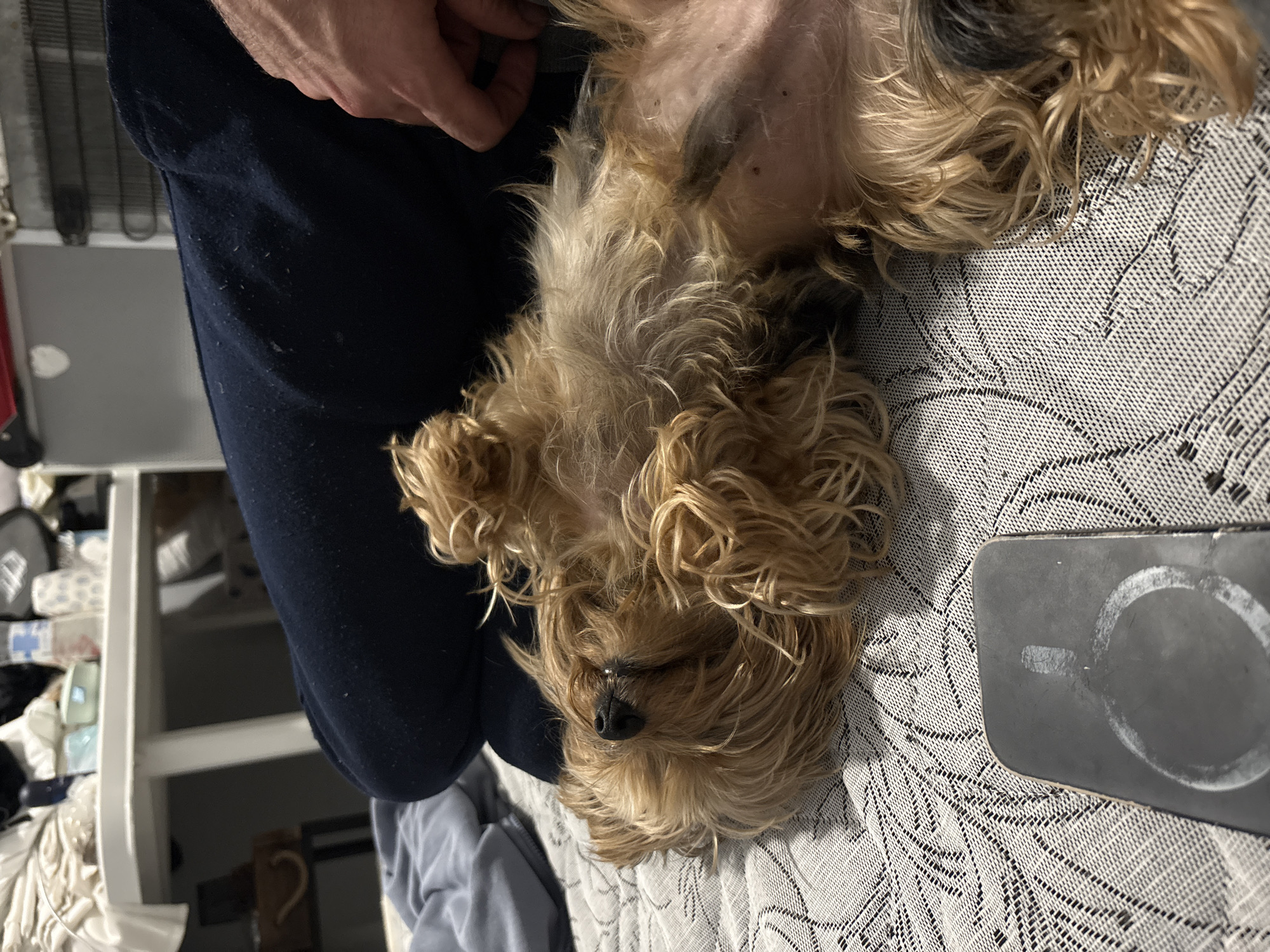 - "small, tan and black dog, possibly a Yorkshire Terrier, lying on its back on a patterned surface, likely a bedspread" by FM-RmSpq2, licensed under CC BY 4.0