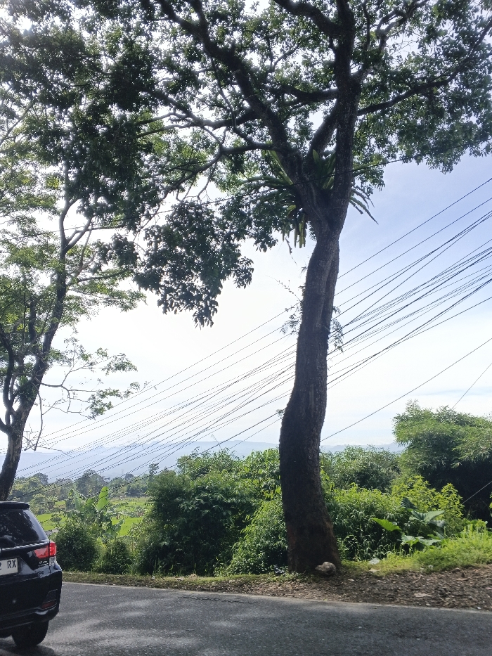 A lush, green landscape unfolds with dense vegetation covering rolling hills beneath a partly cloudy sky. A tall, mature tree dominates the scene, its branches extending widely, partly obscuring the sky. Power lines crisscross the sky above the tree. Part of a black vehicle is visible on the left, parked beside the road.