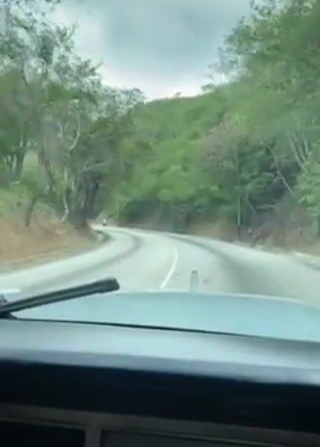 A person drives on a winding asphalt road in the daytime. The road is bordered by lush green vegetation on both sides, with a few sparse trees visible. The sky is overcast. The view is from inside a vehicle, focused through the windshield. We see part of the car's dashboard and windshield wipers. In the distance, another vehicle, red, rounds a bend in the road. Later, it is followed by another dark-colored car.