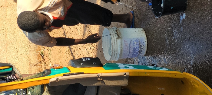 A man in a tan shirt and dark pants stands beside a yellow and green auto rickshaw. He's holding a wire that dips into a white bucket filled with water. Another black bucket is visible nearby. Water is splashed on the ground, creating wet patches on the pavement. The scene is outdoors with a sandy or concrete background.