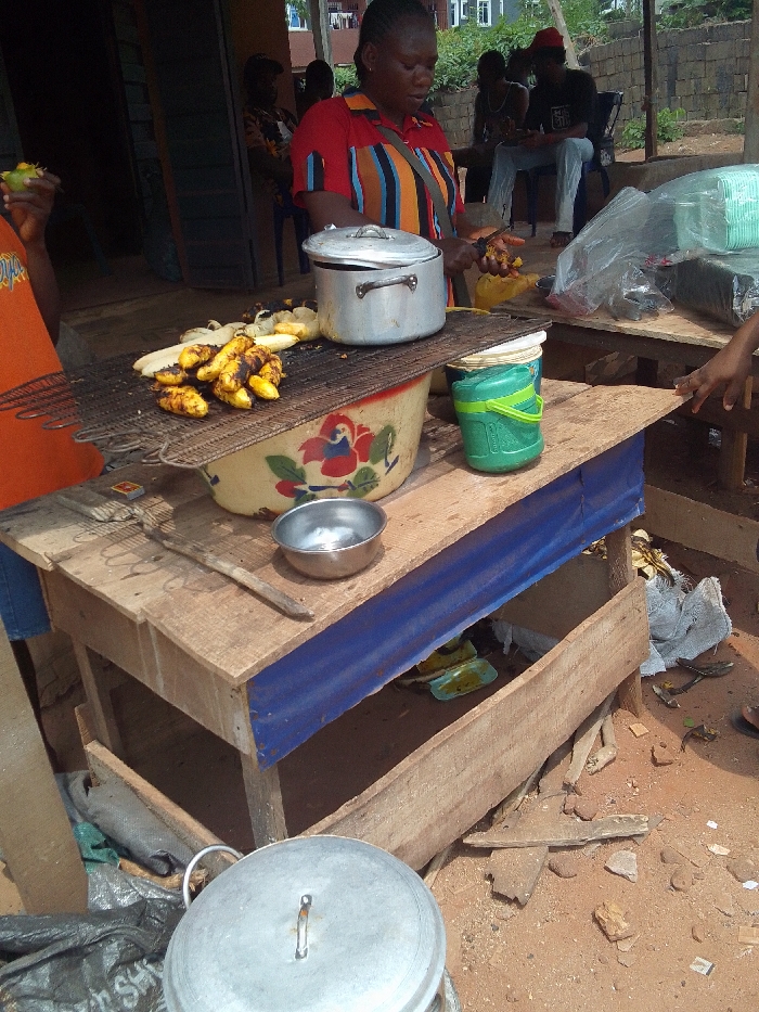 The image depicts an outdoor food preparation and service area in Nsugbe, Nigeria