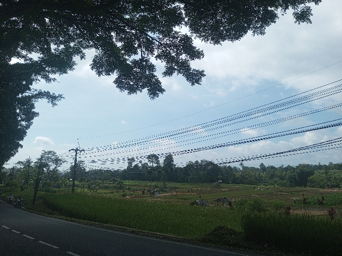 A rural scene shows a road curving alongside a lush green field dotted with small huts. Overhead, a dense canopy of tree branches frames a bright sky with scattered clouds. A series of power lines stretch across the sky, adding a visual layer. A utility pole is visible in the background, and trees line the horizon, creating a natural backdrop.