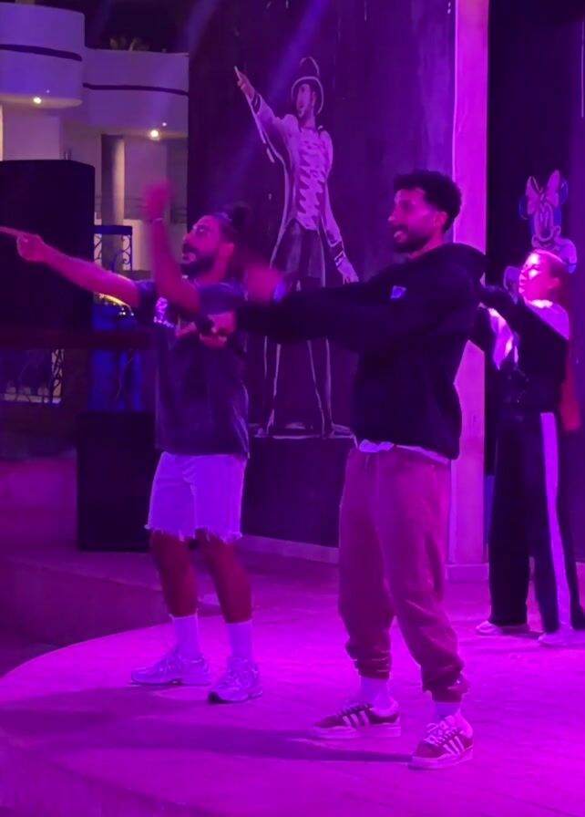Two men are dancing on a stage outside, bathed in a purple glow. The man on the left has a beard and his hair in a bun. He's wearing a dark t-shirt, frayed white shorts, white socks, and white sneakers. The man on the right also has a beard and is wearing a black hoodie, red pants, white socks, and brown sneakers. They point forward, then cup their hands around their mouths, moving rhythmically to the music. Behind them, a woman in a black and white outfit claps her hands. Behind the group, there's a dark wall with a painting of a man in a tuxedo and a Minnie Mouse cartoon. The stage is round and elevated. A speaker sits on the left. The setting appears to be an outdoor party or show.