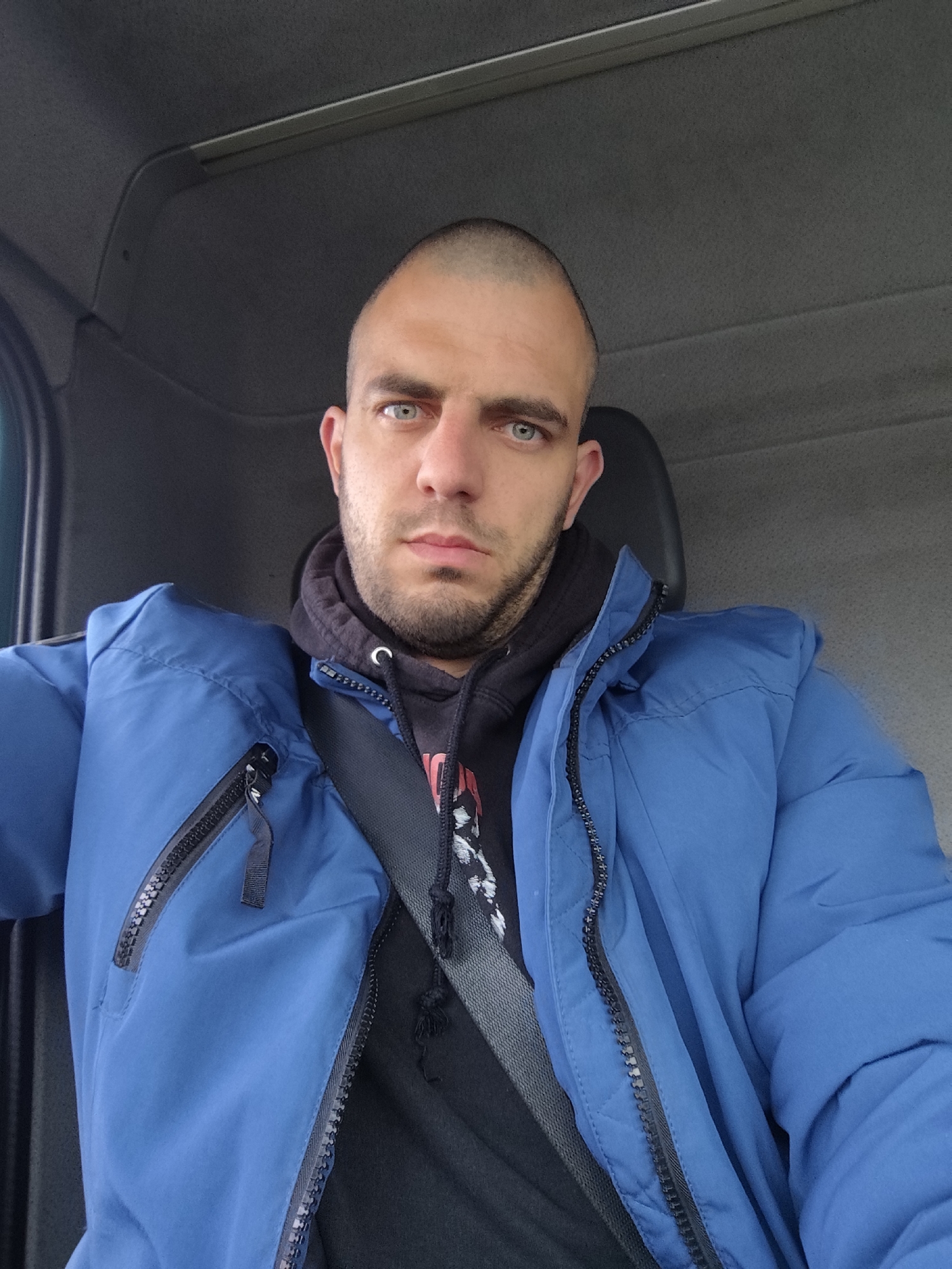 A man is sitting in what appears to be the driver's seat of a vehicle. He is wearing a blue puffer jacket over a black hooded sweatshirt. He has a shaved head and light-colored eyes. A seatbelt is fastened across his chest. The interior of the vehicle has a gray color scheme. The image does not provide any information to determine the location as Stara Zagora, Bulgaria.
