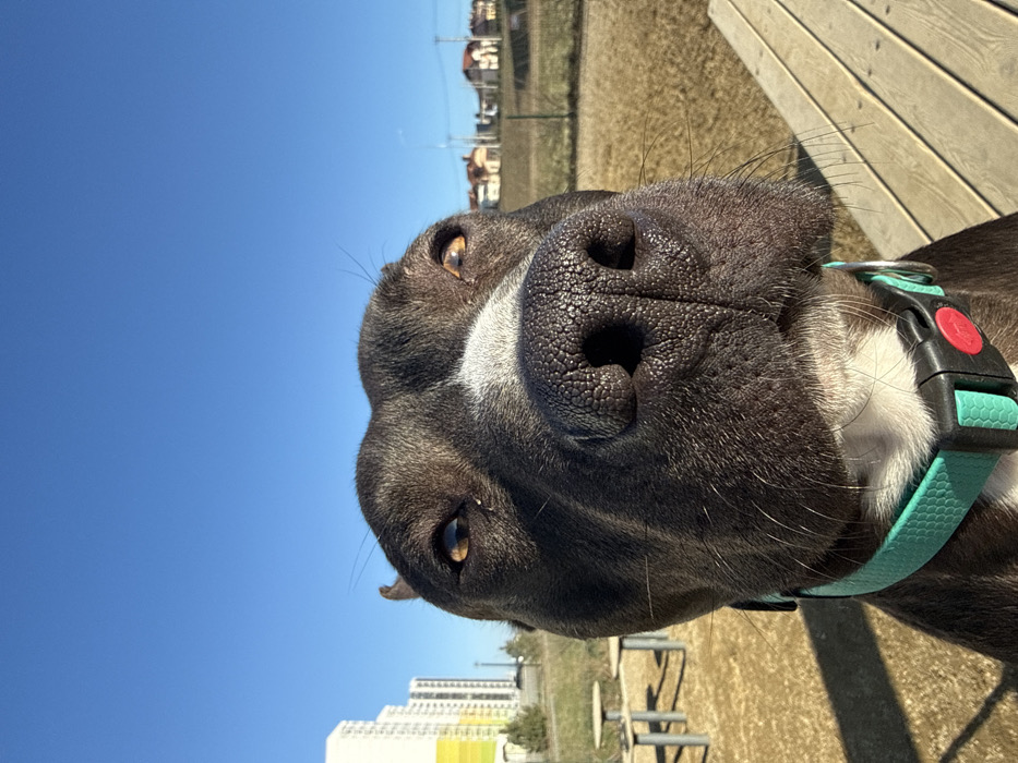 - "The image presents a low-angle, close-up view of a dark brindle Pit Bull-type dog with distinct white markings, including a blaze between its eyes and across its chest" by FM-Q0AMB2, licensed under CC BY 4.0
