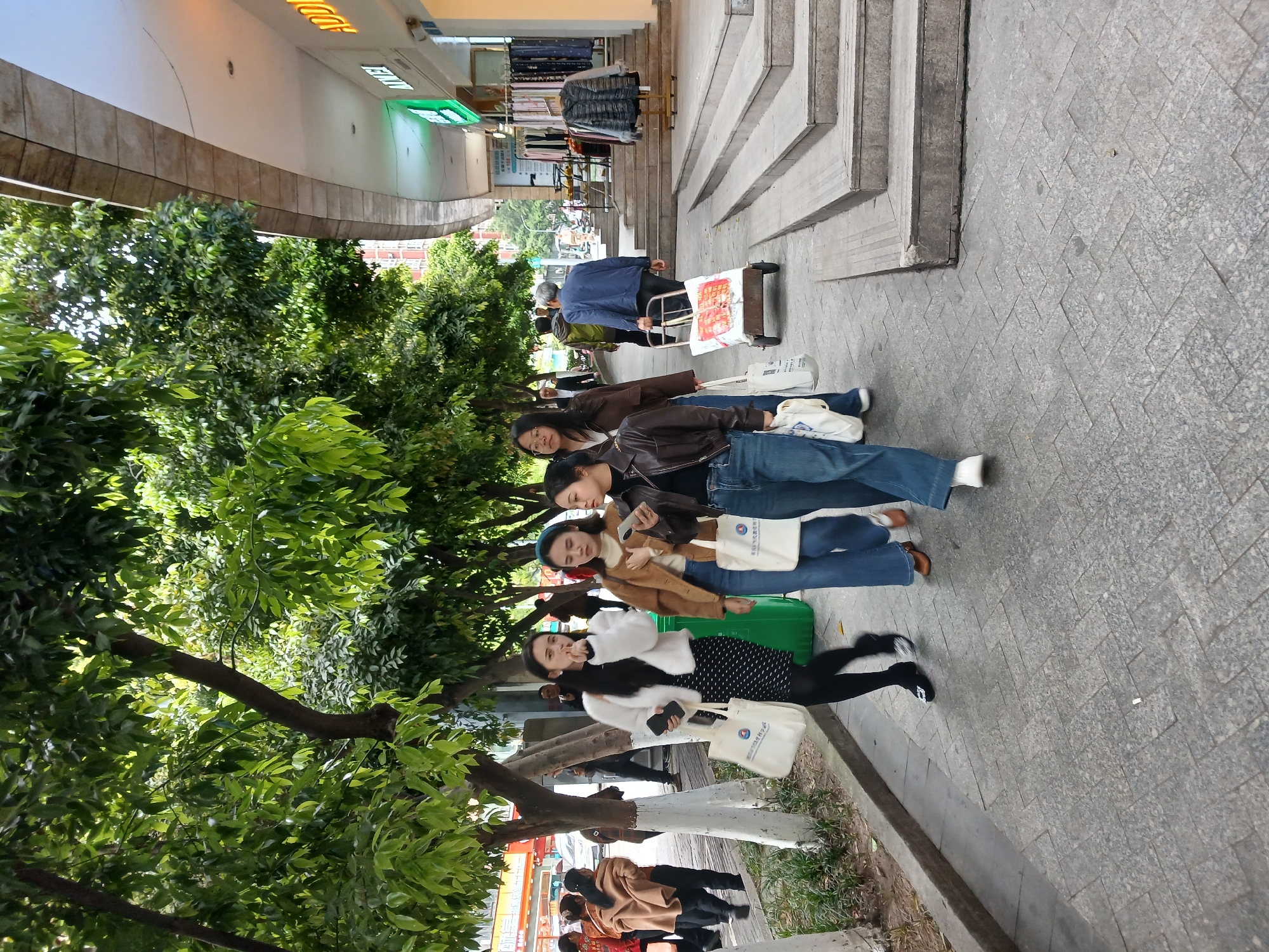 This image depicts a commercial street sidewalk in Jiulongpo District, China. The scene is observed from a slightly elevated perspective, looking along a grey paved sidewalk. In the foreground and midground, four young adult women are walking from the right side of the frame towards the left. The woman at the front (left-most of the group) wears a white faux-fur jacket over a black polka-dot dress, black tights, and black flat shoes; she carries a black smartphone in her right hand and two white tote bags, each featuring a blue circular logo, in her left hand, which is raised to her mouth. Beside her, a woman in a brown jacket, white top, and blue wide-leg jeans holds a white smartphone and one white tote bag with the same blue logo. Behind them, a third woman in a brown jacket and blue jeans carries a similar white tote bag. The fourth woman in the group is partially obscured. To the right of the women, an older man in a blue jacket and dark trousers is pushing a two-wheeled handcart loaded with a large white bag. A green public waste bin is positioned between the women and a row of trees lining the sidewalk. These trees have green foliage, and their lower trunks are painted white. To the immediate right of the sidewalk, a building with a curved concrete overhang houses retail establishments. Visible signage includes a green "AIMELI" sign and an orange "ADD..." sign. Clothes on display racks are set up outside one of these stores, near a series of concrete steps leading up to the building's entrance. In the background on the left, additional pedestrians, vehicles, and multi-story buildings are partially visible, indicating a busy urban environment. The scene is illuminated by natural daylight.