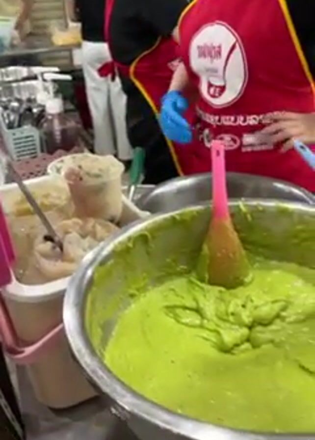 busy food stall in what appears to be a market or food court setting. The stall is selling what seems to be desserts or snacks. A woman wearing a red apron with writing on it is working at the counter, wearing blue gloves, scooping something out of a bowl with a pink-handled utensil. There are various ingredients and containers visible on the counter, including a large bowl of a bright green mixture, several smaller containers filled with different toppings or ingredients (including what looks like jellies or fruits), and rows of pre-made snacks or desserts in cups displayed in a refrigerated case. Other people are visible in the background, either working at the stall or as customers. A QR code payment option is visible on the counter. The environment is bustling with activity and appears to be a popular spot for food.