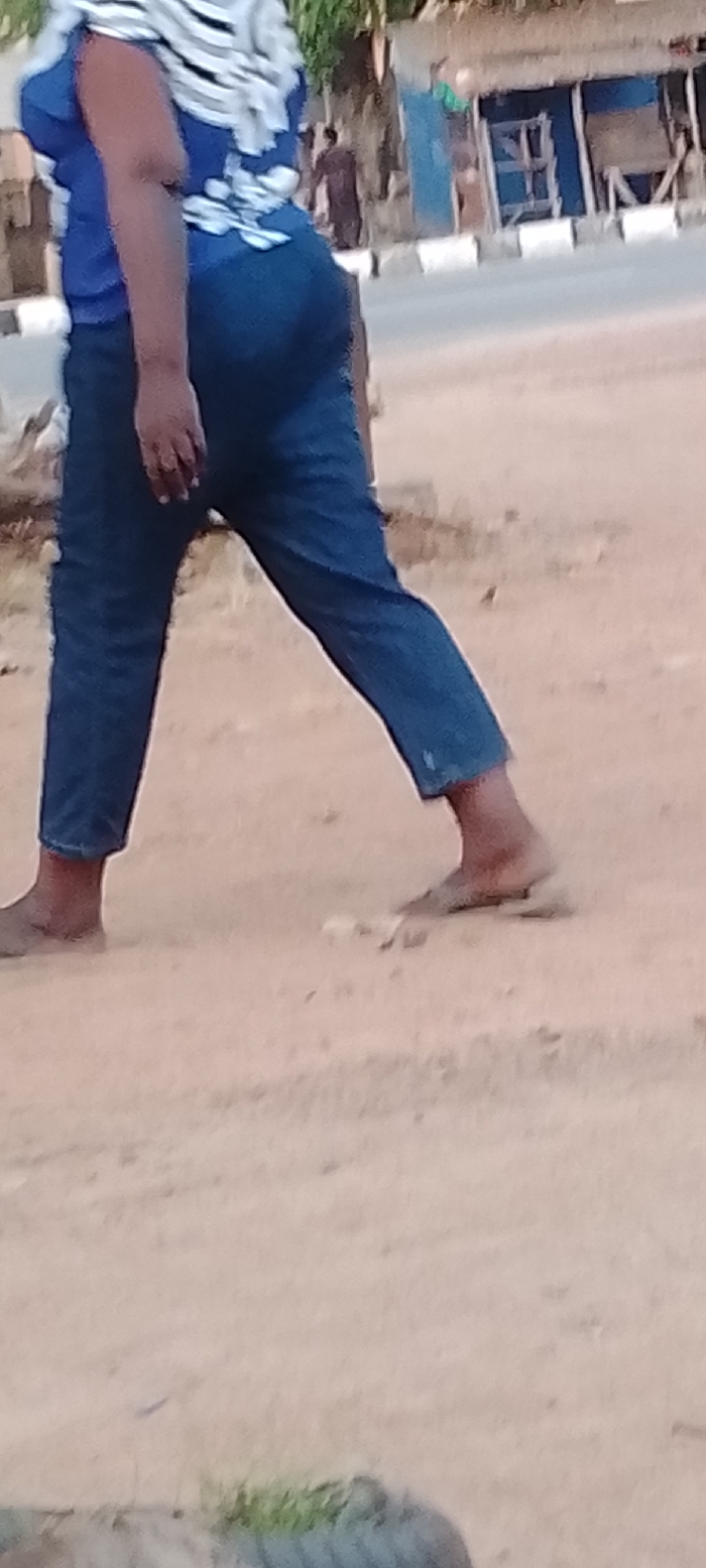 The image depicts an individual walking on an unpaved, light brown dirt surface in Adankolo, Nigeria
