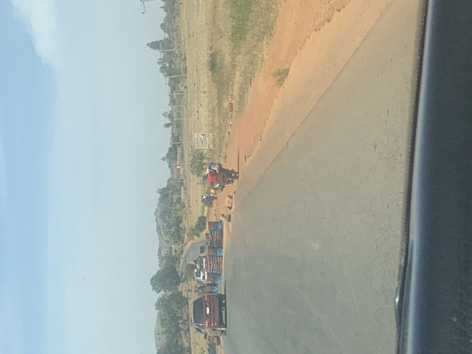 A road scene shows various vehicles parked along the roadside. There are cars, a motorcycle with multiple riders, and what appear to be goods or merchandise displayed near the vehicles. The landscape on the side of the road is dry and grassy, with some trees and telephone poles visible in the background. The sky is light blue. A portion of a car's interior is visible in the foreground, suggesting the image was taken from inside a vehicle.