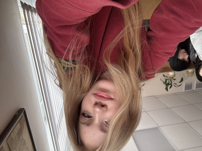 This image depicts an indoor scene within an educational institution in Saint Petersburg, Russia. The primary subject is a young light-skinned female positioned in the foreground, with long, wavy blonde hair partially obscuring her face. She looks directly at the camera with a slight smirk, exhibiting minor facial blemishes on her forehead and nose. She wears light pink eyeshadow and mascara. Her attire consists of a maroon or dark red hooded sweatshirt, which displays a circular fabric patch with a yellow/green compass rose logo, identifiable as the Stone Island brand emblem, on her left upper arm. To her left and slightly behind, two other individuals are partially visible. One female has dark, straight hair and is looking downwards, away from the camera. The head of a third individual is partially visible further left. The environment is consistent with a classroom or lecture hall. It features a white grid-patterned suspended ceiling with integrated rectangular lighting fixtures. The walls are light-colored. A large window fitted with vertical white blinds is present on the right side, providing natural light. On a shelf along the back wall, at least two potted plants in yellow containers are visible. A dark-framed, black and white portrait of an older man is mounted on the wall to the right, near the window. Text visible below the portrait includes "Академик П.С." (Academician P.S.). Wooden desk surfaces are partially visible in the foreground and where the secondary subjects are seated. The primary subject is engaged in posing for the photograph. The other visible individuals are seated and appear to be independently occupied.