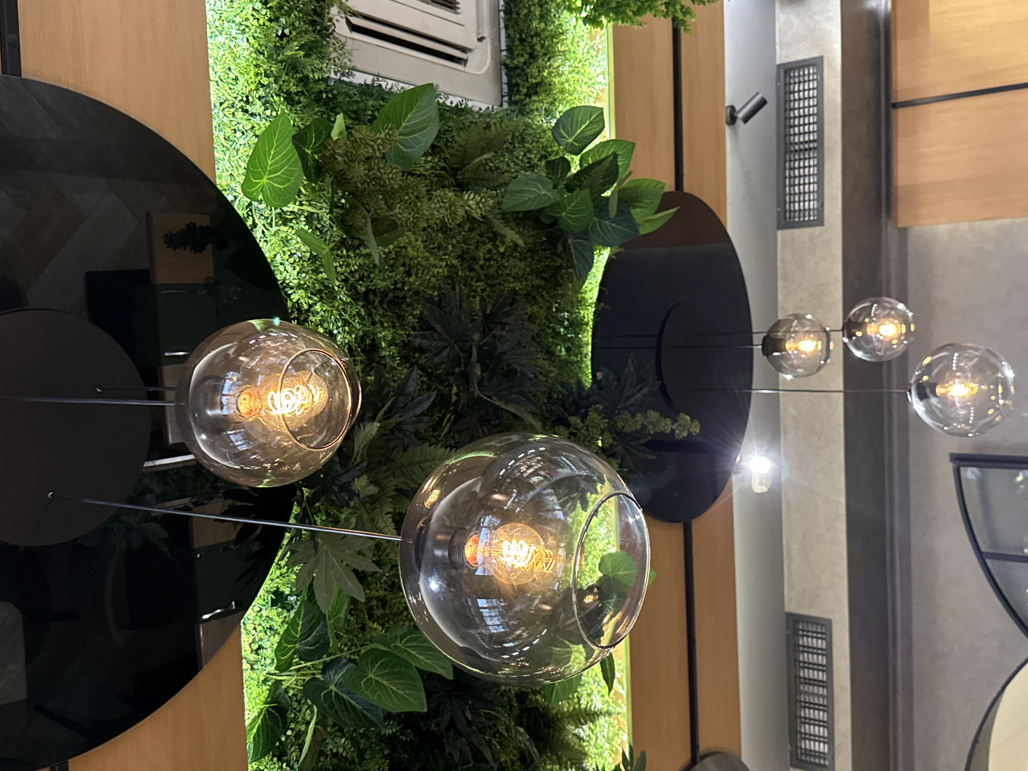 The image depicts an indoor space featuring decorative elements and lighting fixtures