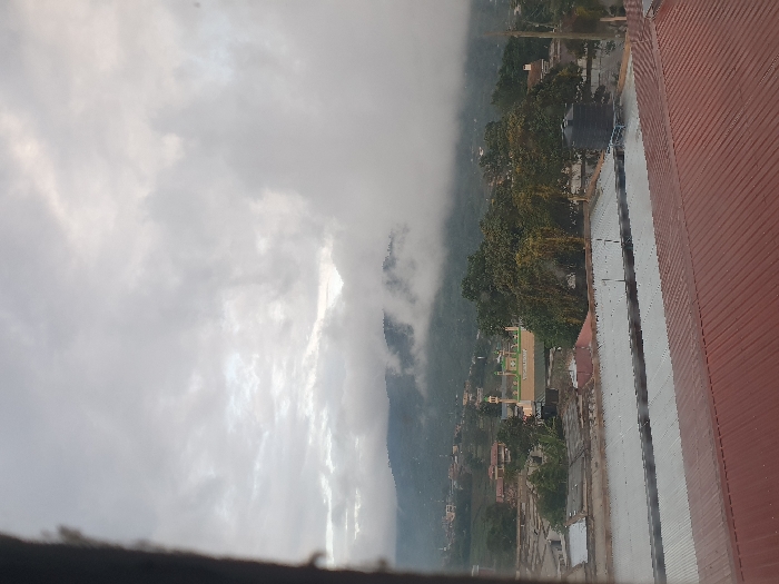 A landscape view features buildings interspersed with trees, partially obscured by clouds clinging to a mountainside. A flat, possibly corrugated roof edge is visible on the right. The sky is overcast with heavy, gray clouds. The scene appears to be taken from a higher vantage point, overlooking the terrain. Buildings closer to the viewer appear to be constructed of simple materials.
