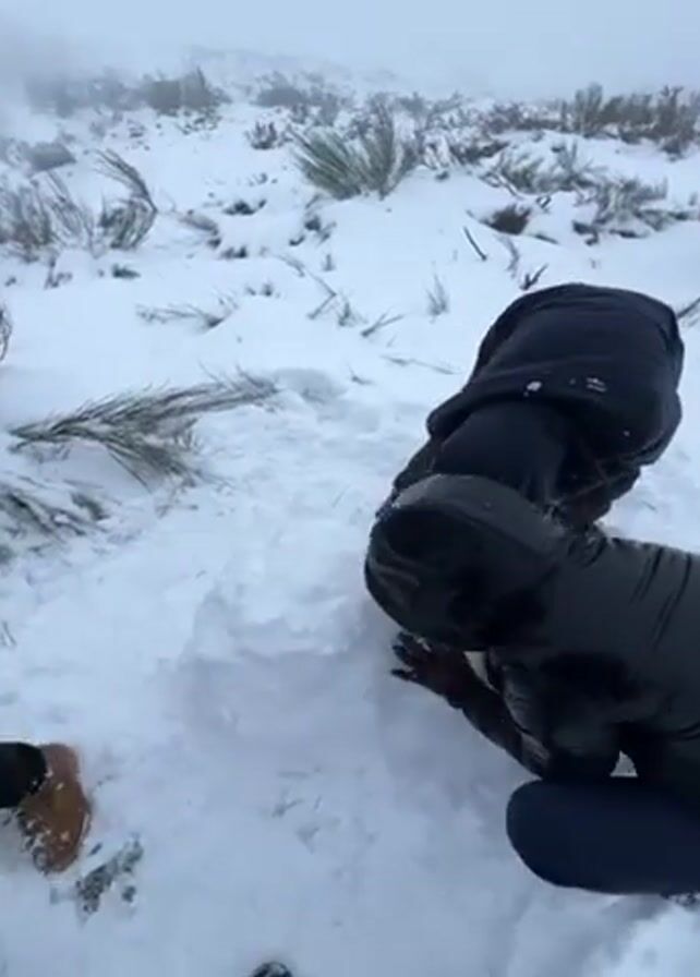 Three individuals are constructing a small snowman in a snowy landscape. The snow covers the ground, with sparse, low-lying vegetation visible amidst the snow cover. The weather appears overcast and misty. The people are wearing winter clothing, including puffy jackets with hoods, gloves, and boots, to protect themselves from the cold. They are kneeling and bending over, using their hands to pack and shape the snow. The snowman appears to be at an early stage of construction, with a spherical base already formed.