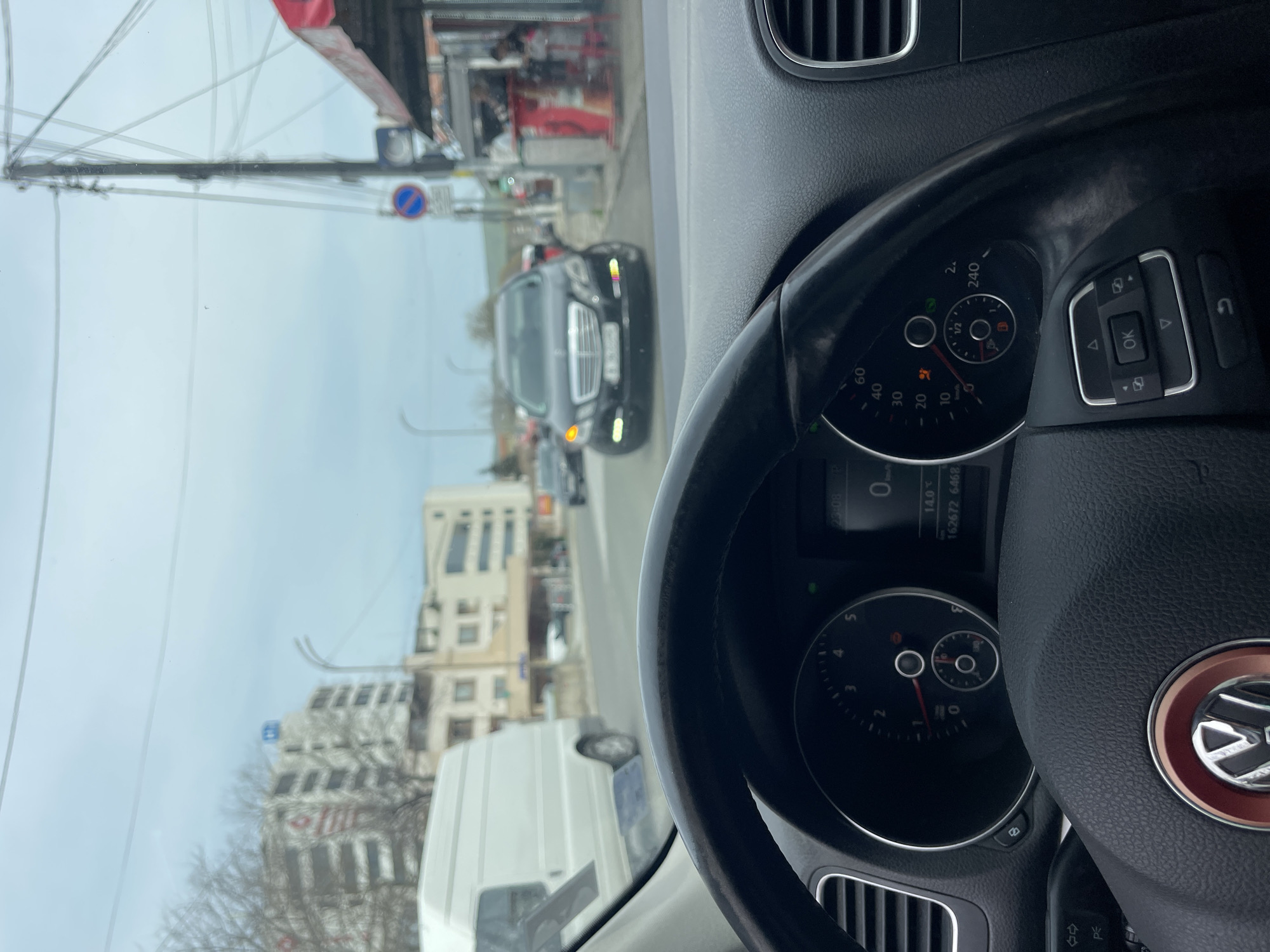 A view from inside a car, likely a Volkswagen, looking out at an urban scene