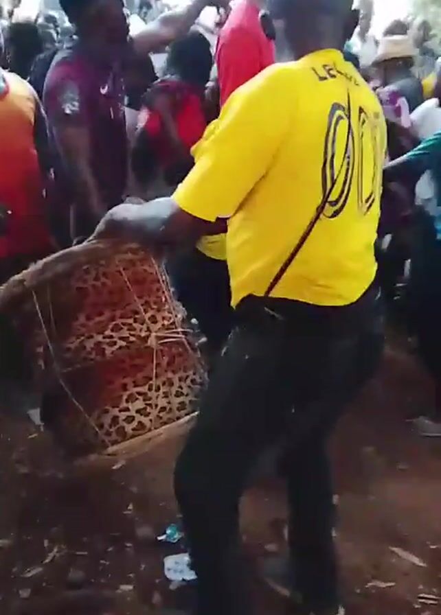 A man wearing a yellow shirt with black writing, black pants, and grey sneakers is playing a drum with an animal print covering. The drum is slung over his shoulder with a brown strap. He is walking in a crowd of people. There are men, women, and children in the crowd, many of whom are looking at the man with the drum. The crowd is standing on a patch of dirt with sparse vegetation. Behind the crowd is a large black water tank. A sliver of blue sky is visible above the trees in the background.