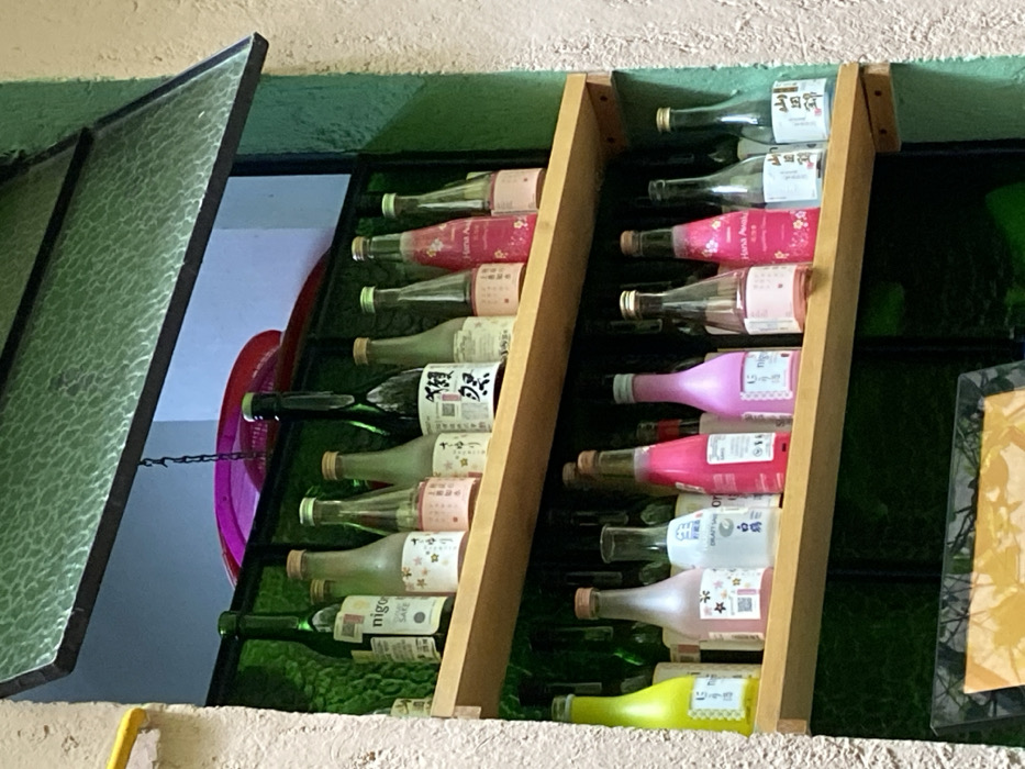 - "The scene depicts a detailed display of approximately 21 assorted glass bottles, primarily identified as sake, arranged on two light-brown wooden shelves within a window opening" by FM-Cwxsv2, licensed under CC BY 4.0