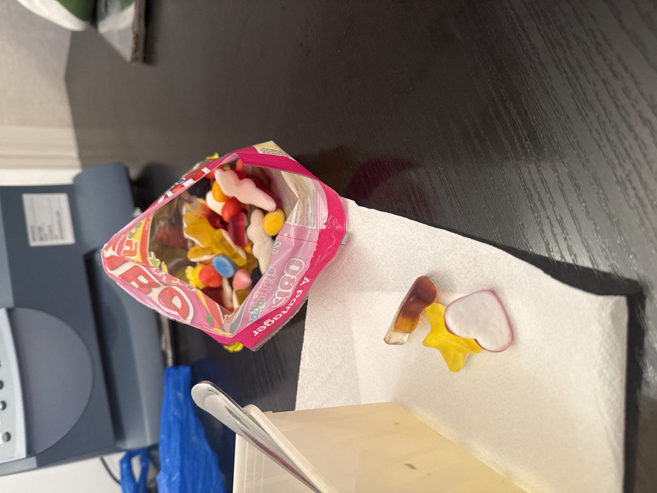The image depicts an indoor scene on a dark, textured tabletop. In the midground, an open, pink and white bag of Haribo brand gummy candies, bearing the French text "A partager," is visible, containing a variety of multicolored gummy sweets in shapes such as bears, worms, clouds, and bottles. To the left of the candy bag, a white paper towel holds three distinct gummy candies: a yellow star, a translucent brown cola bottle, and a white heart with a pink outline. Further to the left, a pale, opaque container, likely plastic, holds a metallic spoon. In the background, out of focus, a crumpled blue plastic bag rests behind the container, and a large, dark grey or blue piece of machinery or electronic equipment is partially visible. No individuals are present in the scene. The specific location within the city of Paris, France, cannot be identified based on the visual evidence in the image.