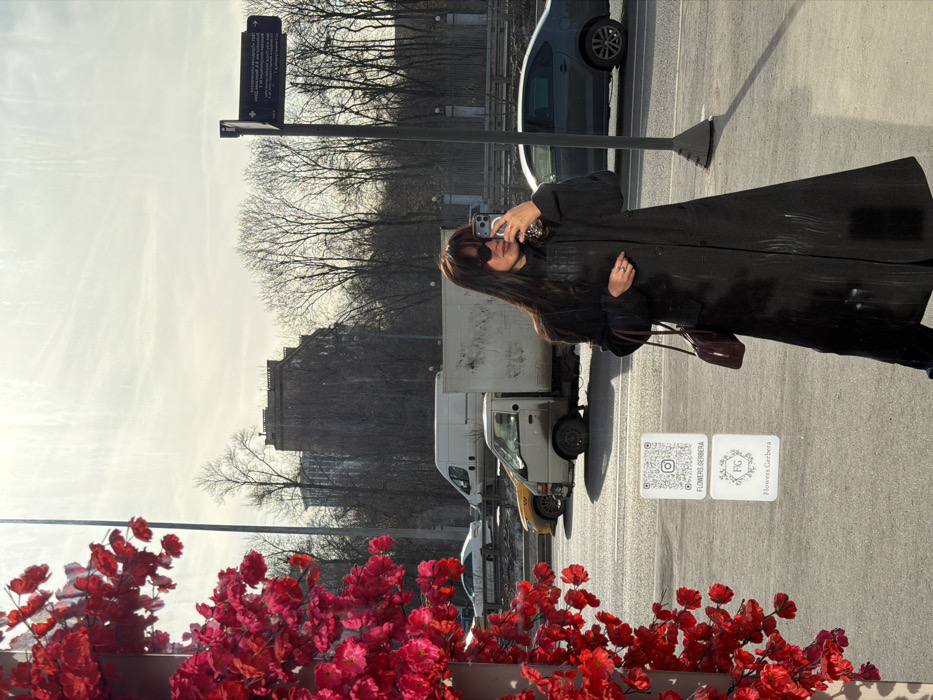 The image depicts an outdoor urban scene in Perepechino, Russia, under bright daylight with visible shadows. A female individual, dressed in a long, dark coat and dark sunglasses, is positioned centrally, holding a smartphone in her right hand as if taking a selfie. She has long, dark hair and carries a small, dark red handbag over her left shoulder. The individual appears to be reflected in a large, vertical reflective surface, possibly a window, which shows streaks and glare. On this reflective surface, two white square decals are visible: one with a QR code and the text "FLOWERS.GERBERA," and another below it featuring a stylized floral logo and "Flowers Gerbera" text. To the immediate left, a dense cluster of vibrant red artificial flowers extends into the frame. Beyond the reflective surface and the individual, a multi-lane asphalt road is visible with several vehicles, including a white cargo van, a light-colored pickup truck, a yellow sedan (possibly a taxi), a dark grey sedan, and a white sedan in the distance. Further into the background, a street sign on a dark pole points right, displaying Cyrillic text indicating "MVD Perepechino" (Ministry of Internal Affairs Perepechino) and "GK Peredelkino." Bare deciduous trees line the far side of the road, and multi-story buildings, including one large, older-style structure, are visible against a bright, hazy sky.