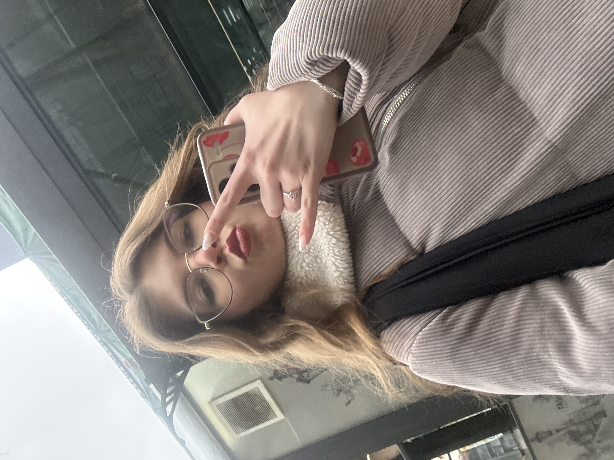 A young woman is taking a selfie. She is wearing round glasses and a light-colored corduroy jacket with a white fluffy collar. Her hair is blonde. She is holding a cell phone with a clear case decorated with red floral designs. She is holding her fingers in a "peace" sign near her face. She is wearing a silver bracelet and a ring. The location is Pernik, Bulgaria.