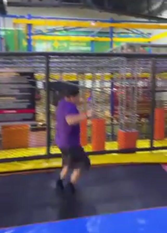 A man in a purple t-shirt and gray shorts attempts a backflip off a trampoline in an indoor play area with various obstacle courses and padding