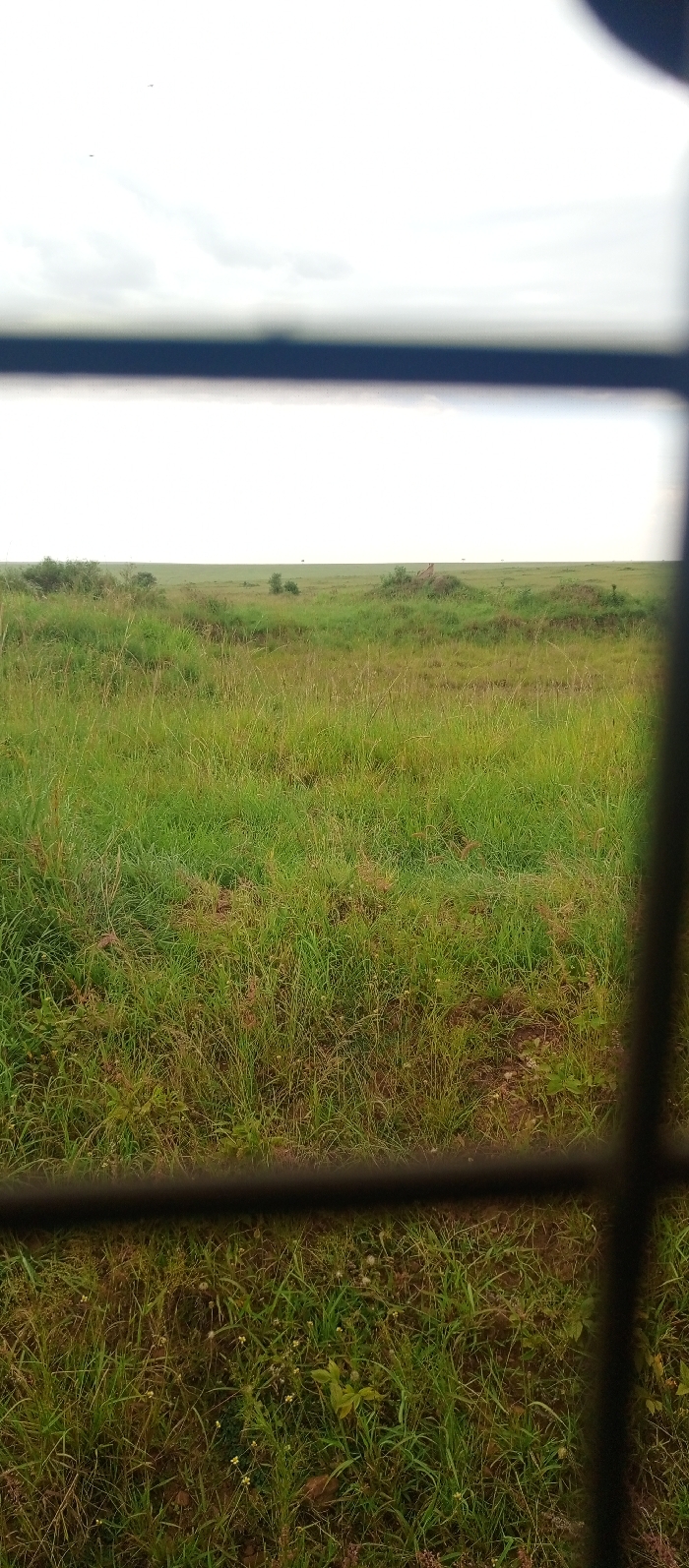 The image depicts an expansive, natural grassland environment located in Siana ward, Kenya, viewed through a dark, grid-like obstruction. **Subjects and Objects:** The foreground is obscured by dark, out-of-focus horizontal and vertical bars, indicating a view through a window or barrier. Beyond this obstruction, the dominant feature is a vast, open grassland. The ground is covered densely with tall, green and yellowish-green grasses, interspersed with some areas of brown earth and smaller, lighter-colored plants. Several low, grass-covered mounds or hummocks are visible in the midground. Sparse, small bushes or very distant trees appear as indistinct dark shapes on the horizon. The sky, occupying the upper portion of the image, is overcast and light grey, with diffuse cloud cover. Two minute, dark specks are observable in the upper left quadrant of the sky. **Actions and Interactions:** No human or animal subjects are visible, and no actions or interactions are depicted within the scene. The environment appears uninhabited and undisturbed. **Environment:** The scene represents a typical savanna or prairie landscape, characterized by flat to gently undulating terrain covered predominantly by natural grasses. The lighting is diffused and even, consistent with an overcast day. The overall impression is one of a wild, open, and uncultivated natural habitat.